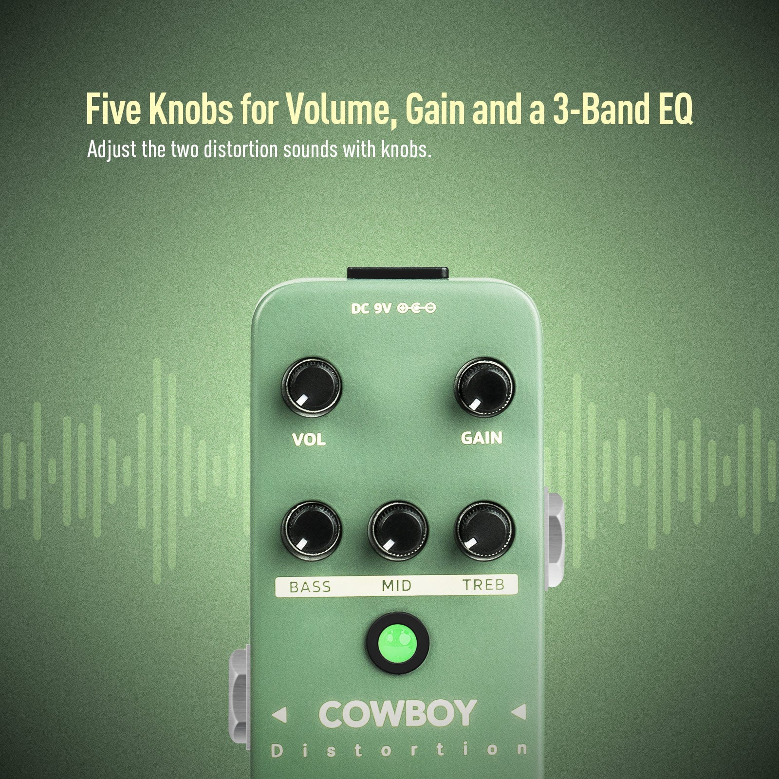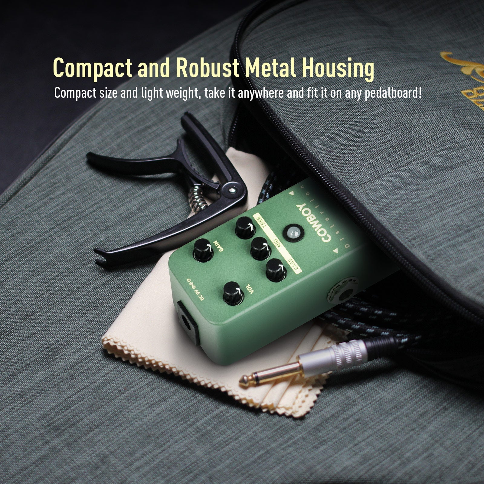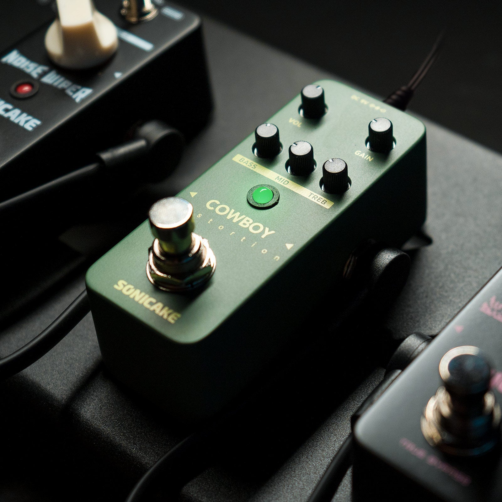 The Sonicake Cowboy Distortion is a high-gain pedal crafted to emulate Dimebag Darrell's legendary tone. Its durable metal casing and heavy-duty footswitch ensure long-lasting performance. The pedal features a mid-filter for a sharper, more powerful sound and a LED Flashing Mode that recalls your last setting, making it a perfect tribute and tool for guitarists seeking iconic distortion tones.